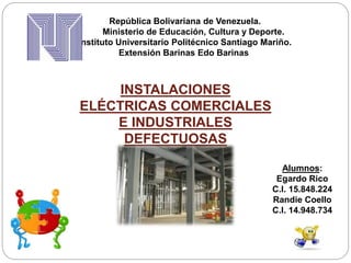 El documento presenta información sobre instalaciones eléctricas defectuosas y la importancia del mantenimiento preventivo. Explica que las instalaciones eléctricas desgastadas en industrias y comercios pueden causar fugas de energía, incendios y ponen en riesgo vidas. También describe las actividades clave del mantenimiento preventivo como inspecciones, pruebas eléctricas y análisis de aceite para transformadores. Resalta que el mantenimiento asegura el rendimiento de equipos y la seguridad de las personas
