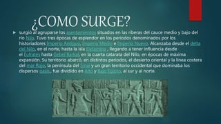 El documento resume la historia y cultura de los antiguos egipcios. Se formó a lo largo del río Nilo y alcanzó su máximo esplendor entre los periodos del Imperio Antiguo, Medio y Nuevo. Desarrollaron una escritura jeroglífica, creencias politeístas y una economía basada en la agricultura apoyada por el río. Construyeron impresionantes monumentos como las pirámides que demuestran sus logros en arquitectura e ingeniería.