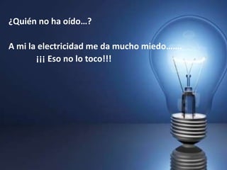 El documento describe las fuentes de generación de energía eléctrica como centrales nucleares, térmicas, hidráulicas, eólicas y fotovoltaicas. Explica brevemente la ley de Ohm y cómo la corriente eléctrica llega a las viviendas a través de las redes eléctricas. Finalmente, pregunta cómo funciona la electricidad una vez que llega a las casas.