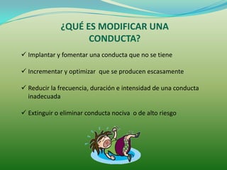 Este documento presenta un resumen de las técnicas de modificación de conducta. Explica que la modificación de conducta implica implantar, incrementar, reducir o eliminar ciertos tipos de comportamientos. Describe las consideraciones iniciales como identificar la conducta objetivo y asegurarse de que sea observable y medible. Luego clasifica las técnicas en aquellas para la adquisición, mantenimiento y eliminación de conductas, dando ejemplos como el reforzamiento, modelado y extinción. Finalmente menciona otras técnicas