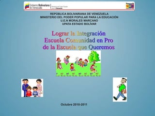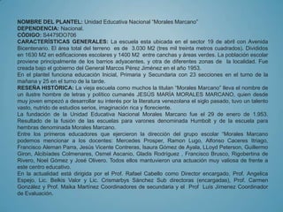 Este documento proporciona información sobre la Unidad Educativa Nacional "Morales Marcano" en Venezuela. En 3 oraciones: La escuela se fundó en 1953 y atiende a estudiantes de educación inicial, primaria y secundaria. Actualmente tiene aproximadamente 1500 estudiantes y personal docente y administrativo. El documento describe la misión, visión, valores y objetivos de la escuela, así como sus fortalezas, oportunidades, debilidades y amenazas.