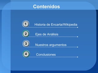 El documento analiza la historia y evolución de Encarta y Wikipedia, destacando sus diferencias en modelos de negocio, acceso al conocimiento y la participación colaborativa. Encarta, lanzada por Microsoft en 1993, perdió relevancia con la llegada de Wikipedia, que promovió un enfoque de contenido libre y colaborativo, culminando en el cierre de Encarta en 2009. La discusión incluye aspectos sobre la propiedad intelectual, la transformación de la información en mercancía y los nuevos modelos de autoridad en la era digital.