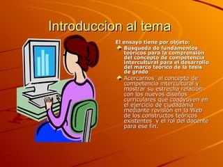 Este documento resume los conceptos clave para el marco teórico de una tesis sobre competencias interculturales, diseños curriculares y competencias docentes. Explora la definición de competencia intercultural y su relación con nuevos diseños curriculares para fomentar la ciudadanía. También examina el rol del docente y el uso de medios digitales para apoyar la investigación de la tesis.