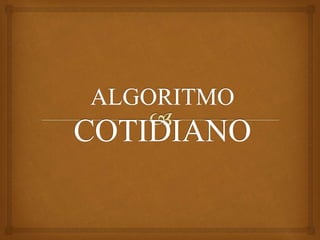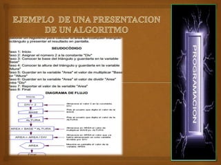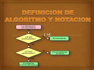 El documento define un algoritmo como una secuencia ordenada y finita de operaciones para resolver un problema. Explica que los algoritmos pueden representarse gráficamente o mediante notación y destaca algunos conceptos importantes como variables, tipos de datos, expresiones y operaciones de entrada/salida. Además, describe las características de un algoritmo como ser preciso, finito y definir claramente el resultado, así como las etapas típicas de entrada, proceso y salida.