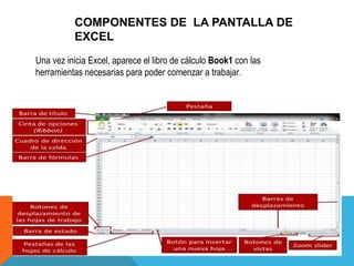 Este documento proporciona una introducción a las funciones básicas de Microsoft Excel, incluyendo los componentes de la interfaz como la cinta de opciones, cómo ingresar y modificar datos, formatear celdas, agregar y eliminar filas y columnas, y guardar, imprimir y cerrar libros de cálculo. Explica cómo navegar y seleccionar celdas, así como aplicar formatos de texto, números, bordes y colores de fondo a celdas.