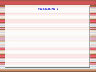 Erasmus+ es el programa de la UE que apoya la educación, formación, juventud y deporte en Europa con un presupuesto de 14.7 mil millones de euros. Tiene como objetivos el crecimiento económico, el empleo, la justicia social e inclusión. Ofrece oportunidades de estudio, experiencia laboral y voluntariado a más de 4 millones de europeos.