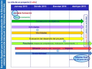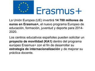 La Unión Europea invertirá 14 700 millones de euros en Erasmus+, el nuevo programa de educación, formación, juventud y deporte para 2014-2020. Los centros educativos españoles pueden solicitar proyectos de movilidad dentro de Erasmus+ para desarrollar su estrategia de internacionalización y mejorar la enseñanza. Un colegio español presentó un proyecto llamado "Aprendiendo en Europa" que recibió 96 puntos, concediéndole 5 movilidades y 9.777€ para cursos en Portugal, Reino Un