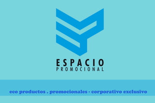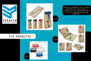 Este documento presenta una variedad de productos ecológicos y promocionales para empresas. Los productos son amigables con el medio ambiente y ayudan a las compañías a desarrollar su responsabilidad social. Se ofrecen artículos como bolsas ecológicas, portatarjetas, portavasos y más, fabricados con materiales como tela quirúrgica y cartón reciclado. La empresa se especializa en contribuir a reducir la contaminación mundial a través de sus productos ecológicos.