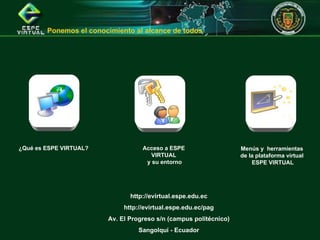 El documento describe el Sistema Virtual de Educación Continua (ESPE VIRTUAL) de la Escuela Politécnica del Ejército de Ecuador. ESPE VIRTUAL es una plataforma educativa virtual que permite la interacción entre estudiantes, profesores e institución a través de servicios como mensajería, foros de discusión, videoconferencias y acceso a materiales de aprendizaje. El documento explica cómo acceder y navegar por la interfaz de ESPE VIRTUAL, incluyendo las diferentes secciones y herramientas