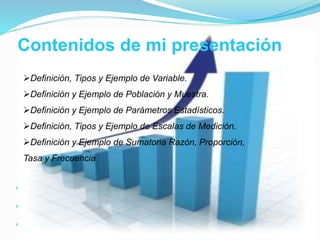 El documento presenta conceptos fundamentales de estadística, abordando definiciones y ejemplos de variables, poblaciones, muestras y parámetros estadísticos. Detalla los tipos de variables cualitativas y cuantitativas, así como las escalas de medición y el uso de sumatorias, razón, proporción, tasa y frecuencia en análisis estadísticos. Se resalta la importancia de las muestras representativas para estudiar características de poblaciones y el cálculo de parámetros estadísticos para crear modelos de realidad.