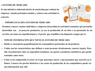 El estudio de mercado es crucial para que las empresas comprendan el entorno en el que operan y ajusten sus productos a las necesidades del consumidor, identificando el comportamiento del sector y el perfil de los consumidores potenciales. Asimismo, se aborda la clasificación de productos y servicios, la importancia de la fijación de precios, y el papel de la oferta y la demanda en la planificación comercial. Finalmente, se destacan las características de los productos y el papel de los canales de distribución en la ampliación del mercado.