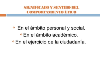 Este documento discute el significado y sentido del comportamiento ético en diferentes ámbitos. Explica que la ética se refiere a los principios de la conducta humana y debe aplicarse en lo personal, académico y como ciudadano. En lo personal, la ética implica la autovaloración y desarrollo de valores. En lo académico, significa actuar de forma deseada en la educación mediante el respeto entre profesores y estudiantes. Como ciudadano, la ética involucra derechos como la libertad de expresión y pensamiento para vivir de ac