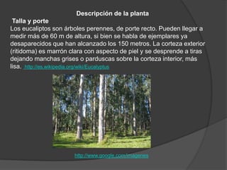 El eucalipto es un árbol perenne originario de Madagascar que puede alcanzar más de 60 metros de altura. Sus hojas jóvenes son ovaladas y grises, mientras que las adultas son coriáceas y de color verde azulado brillante. Produce flores blancas solitarias y frutos capsulares negros. Se usa comúnmente para tratar afecciones respiratorias debido a sus propiedades antivirales, antibacterianas y expectorantes. Aunque se planta comercialmente, los monocultivos de eucalipto