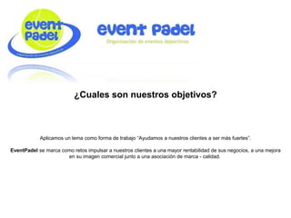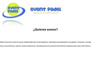 EventPadel es una empresa formada por profesionales del deporte enfocados en la gestión, formación y competición de padel. Ofrecen servicios como la organización de eventos, clases, formación y patrocinio de jugadores, así como la gestión de clubes, con el objetivo de ayudar a sus clientes a mejorar la rentabilidad y reputación de sus negocios.
