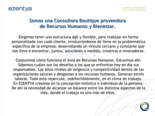 La consultora ofrece servicios de recursos humanos y bienestar, con un enfoque holístico e individualizado en cada cliente. Busca crear ambientes de trabajo con mayor calidad de vida mediante talleres sobre manejo de estrés, actividad física, yoga, masajes, coaching, creatividad y arte, para contribuir a una cultura empresarial más humana y efectiva.