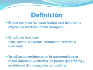 La trigonometría estudia la medición de triángulos y funciones como el seno, coseno y tangente. Se usa para medir distancias estelares y en sistemas de navegación. Explica ángulos positivos y negativos, medidas en radianes, funciones trigonométricas, el círculo trigonométrico y análisis de dominios y rangos de funciones trigonométricas. Incluye ejemplos de cálculo de funciones para puntos dados.