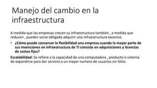 El documento discute la importancia de realizar inversiones adecuadas en infraestructura de TI para una empresa. Explica que se debe invertir ni demasiado ni muy poco para evitar que la infraestructura quede ociosa o no pueda brindar servicios importantes. También analiza el modelo de costo total de propiedad para evaluar los costos directos e indirectos asociados con la infraestructura tecnológica a lo largo de su ciclo de vida.