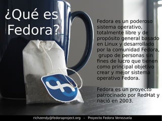 Fedora es un sistema operativo libre y de código abierto basado en Linux desarrollado por la comunidad Fedora. Explica que Fedora ofrece innovación, simplicidad, seguridad y una comunidad sólida de colaboradores. El documento también promueve unirse a la comunidad Fedora y describes algunas de las características técnicas como su manejo de paquetes y ciclos de lanzamiento cada seis meses.