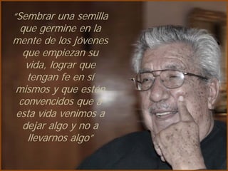El documento presenta reflexiones sobre cómo vivir la vida de manera plena y positiva. Insta a sembrar semillas de fe y convicción en los jóvenes para que tengan confianza en sí mismos y sientan que su propósito es dejar un legado, no solo recibir. También cita frases como "la vida es hoy y es aquí", "vivir es sentir el tiempo" y "la vida hay que vivirla aunque nos cueste la vida".