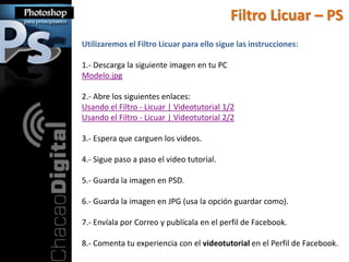 Este documento proporciona instrucciones detalladas sobre cómo usar el filtro licuar en Photoshop, incluyendo la descarga de un archivo de imagen y enlaces a videotutoriales. Se indica que el tutorial se realiza en un entorno Mac y con el programa en inglés. Además, se solicitan comentarios sobre la experiencia en Facebook tras completar el tutorial.