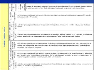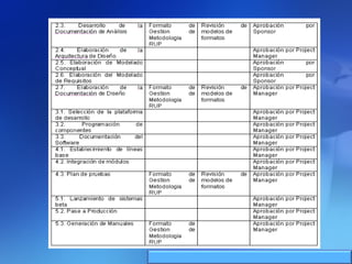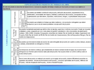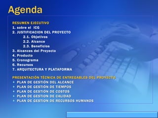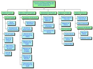 Este documento describe un proyecto para desarrollar un sistema de aprendizaje electrónico (e-learning) para la capacitación profesional en el Instituto de la Construcción y Gerencia (ICG). El proyecto incluirá las fases de análisis, diseño, implementación, integración y pruebas, y puesta en producción del sistema e-learning. Se describen los objetivos, alcances, beneficios, cronograma, recursos, arquitectura y planes de gestión del proyecto.