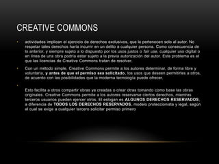 Creative Commons ofrece licencias que permiten a los autores compartir sus obras y permitir ciertos usos por terceros de manera más flexible que el copyright tradicional. Las licencias permiten combinaciones de atribución, uso no comercial, y prohibición de obras derivadas. Esto permite a los autores controlar cómo se usa su trabajo mientras promueve un mayor intercambio y creación de nuevas obras.