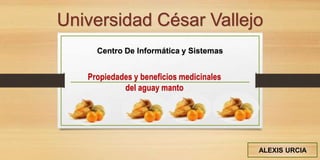 El aguay manto es una planta silvestre con frutos redondos, amarillos y pequeños que crece en Perú y otros países de América del Sur. Contiene vitaminas A, C y B que brindan beneficios para la salud como combatir el acné, el estreñimiento, la diabetes y problemas de próstata, y también aliviar dolores de oídos y prevenir cataratas. Tradicionalmente se consume en estado fresco o en ensaladas para aprovechar su sabor agridulce.