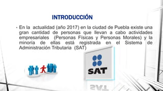 El documento describe las diferencias entre registrarse como persona física o moral ante el Sistema de Administración Tributaria en México. Para registrarse como persona moral se requiere primero registrarse ante la Secretaría de Economía para obtener un acta constitutiva, mientras que para personas físicas los requisitos son menores. Ambos tipos de registro ofrecen beneficios como deducir gastos, expandir la cartera de clientes y acceder a créditos. El proceso de registro toma aproximadamente dos horas y genera obligaciones fiscales a cambio de estos beneficios.