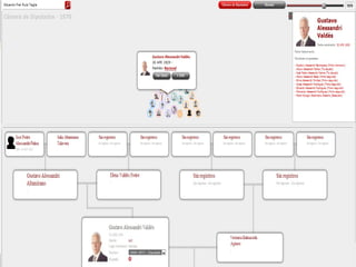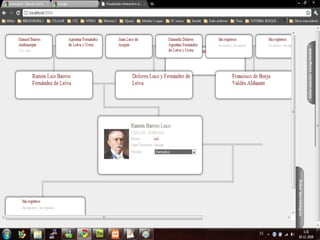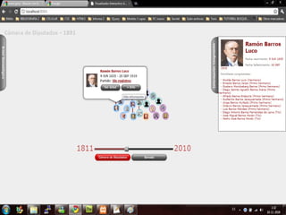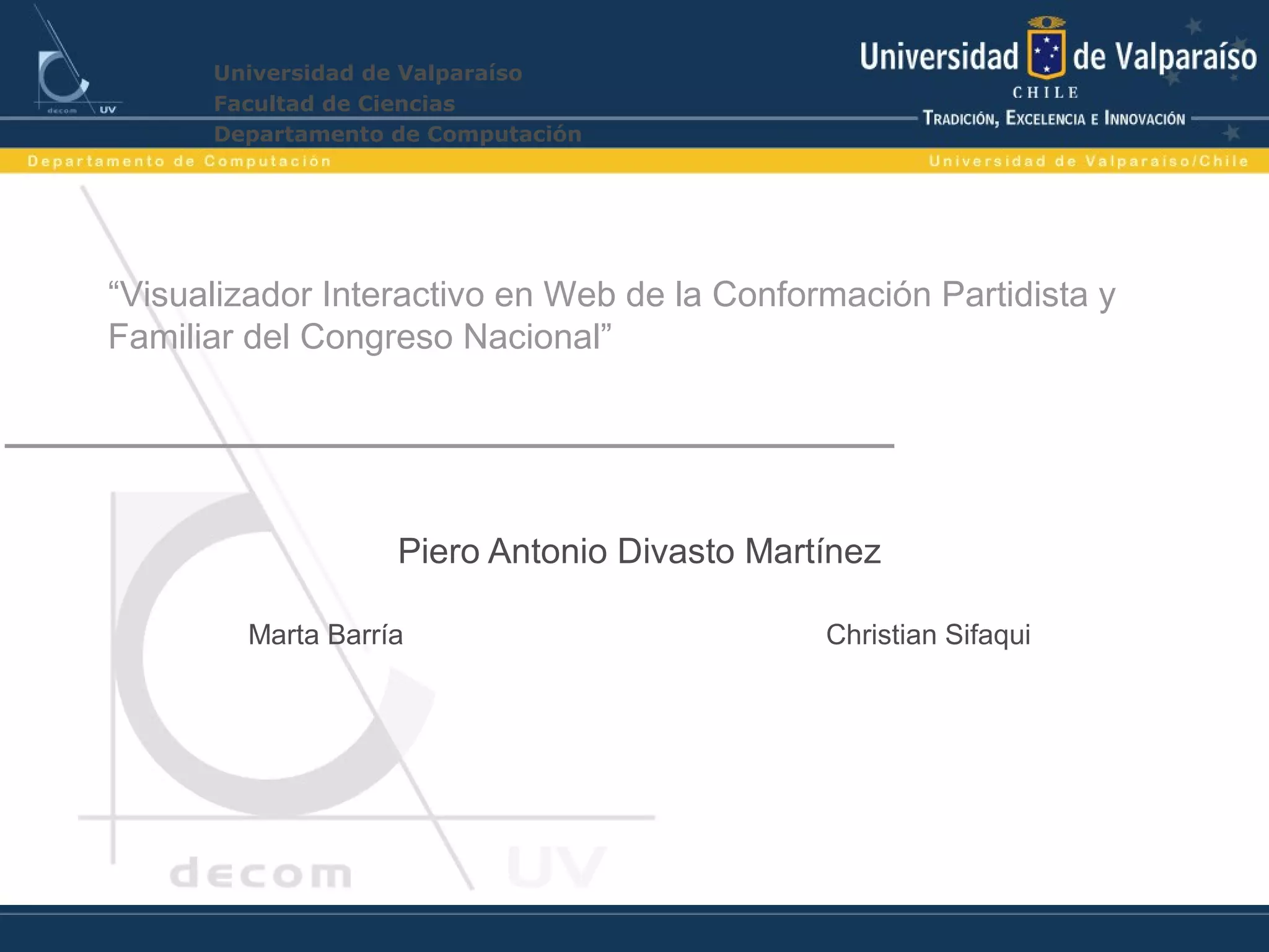 El documento describe un proyecto para crear un visualizador interactivo en la web que muestre la conformación partidista y familiar del Congreso Nacional de Chile a través de la historia. Los objetivos incluyen permitir la visualización de la conformación del Senado y la Cámara de Diputados por año, mostrar los árboles genealógicos de los congresistas, y permitir la carga de nuevas bases de datos genealógicas. El proyecto implementó con éxito la interfaz y pasó las pruebas funcionales y de rendimiento.