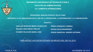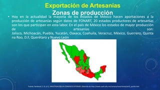 Este documento presenta información sobre las exportaciones de México en diferentes sectores como artesanías, alimentos procesados, maíz, industria textil, petróleo y automotriz para el periodo de 2007 a 2012. Resume los principales estados productores de cada sector, los países importadores, y las empresas líderes en la exportación e inversión extranjera. Además, analiza la clasificación, producción y participación de agentes en sectores como artesanías, alimentos procesados y maíz.