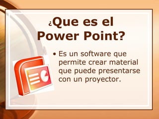 Power Point permite crear presentaciones con texto, imágenes, videos y animaciones que pueden presentarse con un proyector. Se explican las características y comandos básicos de Power Point como insertar diapositivas, cuadros de texto, imágenes, tablas y efectos. También se describe a SlideShare, un sitio para publicar presentaciones en línea de manera similar a YouTube.
