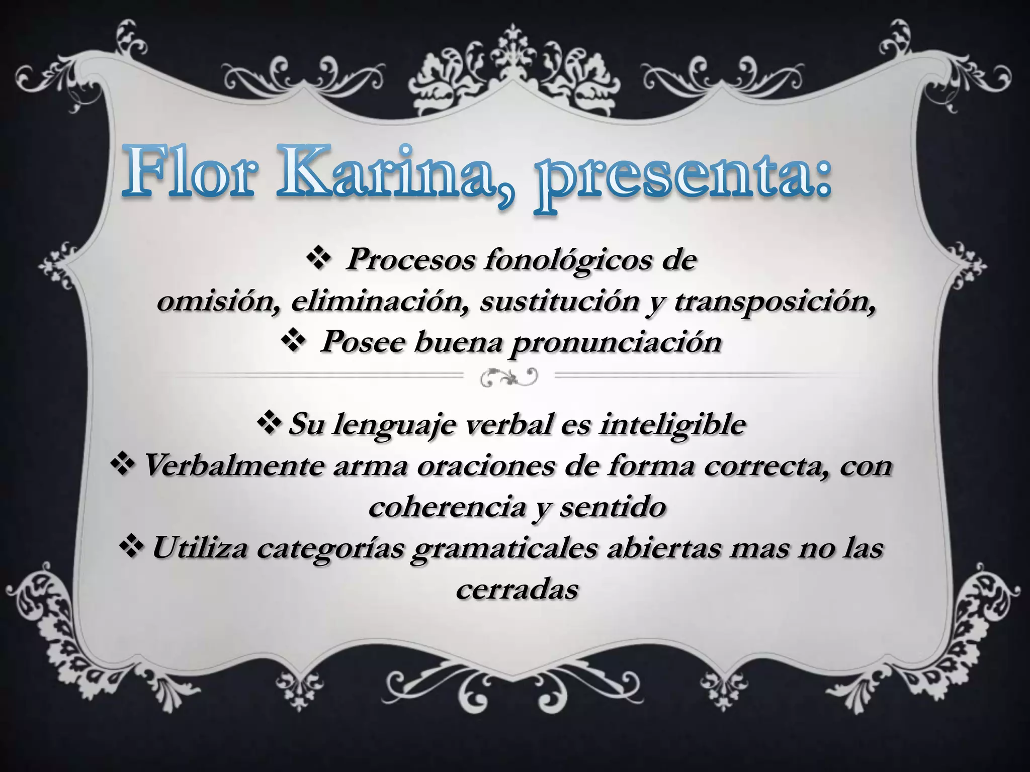 El documento describe las habilidades lingüísticas de una persona que muestra procesos fonológicos de omisión y sustitución pero tiene buena pronunciación. Forma oraciones verbales de manera correcta y coherente usando categorías gramaticales abiertas pero no cerradas, aunque no usa palabras compuestas o derivadas ni oraciones coordinadas u subordinadas. Maneja con dificultad los tiempos verbales, número y género en la oración.