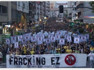 El documento discute los riesgos ambientales y de salud asociados con la técnica de extracción de gas de esquisto conocida como fracking. Explica que aunque el fracking de un solo pozo puede tener impactos moderados, los efectos acumulados de múltiples pozos a lo largo del tiempo pueden conducir a una contaminación significativa del agua subterránea y superficial, emisiones tóxicas al aire, y otros problemas ambientales. También describe la creciente oposición de municipios y grupos en el País Vasco a la prá