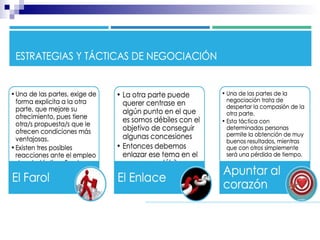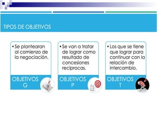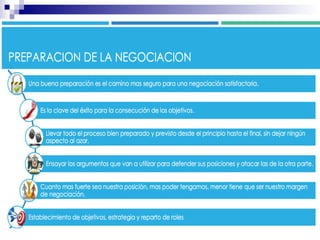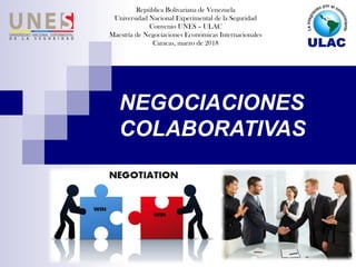 La negociación colaborativa se caracteriza por tres elementos: 1) Los negociadores exhiben una conducta asertiva con el objetivo de ampliar el beneficio mutuo, 2) Se desarrollan relaciones con la otra parte para lograr resultados beneficiosos para todos, y 3) El negociador cede ante criterios objetivos y no ante presiones, centrándose en los intereses y no en las posiciones para alcanzar una situación de ganar/ganar.
