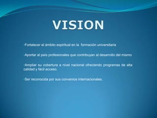 El documento describe los objetivos y principios de una universidad. Busca formar profesionales éticos y competentes que contribuyan al desarrollo del país a través de una educación de alta calidad accesible para todos. También busca fortalecer la formación espiritual de los estudiantes y ser reconocida por sus convenios internacionales.