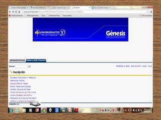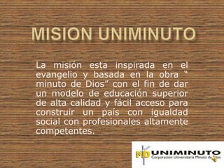 La Universidad Minuto de Dios tiene como misión ofrecer una educación superior de alta calidad y accesible para todos los colombianos con el fin de construir una sociedad más igualitaria. La universidad se distinguirá por su amplia cobertura a nivel nacional y por mantener altos estándares de calidad que contribuyan al desarrollo del país bajo los principios del Evangelio. El documento también describe los derechos y deberes de los estudiantes así como las normas sobre inasistencias a clases.