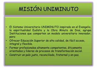 El documento presenta la misión, visión y algunas políticas del Sistema Universitario UNIMINUTO. Su misión es ofrecer educación superior de calidad y formar profesionales éticos para transformar a Colombia en un país justo y en paz. Su visión para 2012 es ser reconocido por su aporte educativo al desarrollo del país y por la calidad de sus programas académicos. También presenta brevemente las políticas de perdida de asignaturas por inasistencia y otorgamiento de becas académicas.