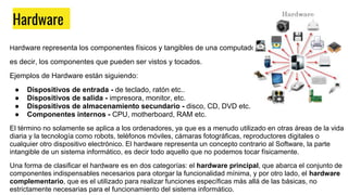 El documento describe los componentes fundamentales de una computadora, incluyendo el hardware (partes físicas como el teclado, monitor y unidades de almacenamiento) y el software (programas y sistemas operativos). Explica que el hardware se ha desarrollado en cuatro generaciones con el avance de la tecnología, mientras que existen diferentes tipos de software como el de sistema, programación y aplicaciones. También define conceptos clave como el sistema operativo y software libre.