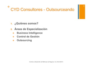 CYD Consultores es una empresa de consultoría fundada en 2010 por Carlos Barranco y Demetrio Romero. Ofrecen servicios de Business Intelligence, control de gestión y outsourcing a través de un equipo multidisciplinario. Utilizan la solución de BI Pentaho de código abierto para ayudar a las empresas a analizar datos y tomar mejores decisiones. También diseñan sistemas de control de costes y ayudan a las empresas a gestionar contratos complejos de outsourcing.