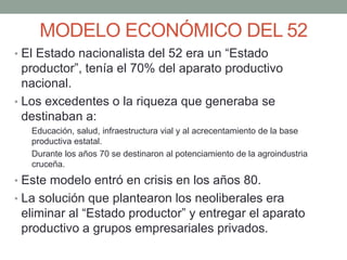 Este documento describe el modelo económico estatal de Bolivia en los años 50 y su crisis en los 80, lo que llevó al gobierno a adoptar políticas neoliberales e iniciar la privatización de empresas públicas. Explica que había alrededor de 462 empresas públicas que los gobiernos querían privatizar presionados por organismos internacionales y la embajada estadounidense. La privatización comenzó en 1991 con 60 empresas de las Corporaciones Regionales de Desarrollo, vendiéndose a precios mucho menores que sus costos de in
