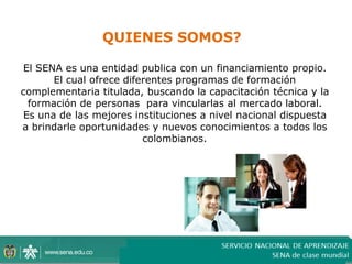 El SENA es una entidad pública colombiana que ofrece programas de formación profesional y capacitación técnica para vincular a las personas al mercado laboral. Su misión es invertir en el desarrollo social y técnico de los trabajadores colombianos a través de formación profesional integral. El SENA busca ser una institución de clase mundial en 2020 que contribuya a la competitividad de Colombia mediante el desarrollo de competencias laborales, la generación de empleo, y el aporte de innovación a empresas y regiones.