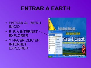 El documento proporciona instrucciones en 3 oraciones para descargar e instalar Google Earth en un computador. Primero, se debe ingresar a Internet Explorer y buscar "Google Earth" en Google. Luego, se debe hacer clic en el primer resultado para acceder a la página de descarga y descargar e instalar el programa. Finalmente, se puede encontrar y explorar lugares específicos una vez abierto el programa desde el escritorio.