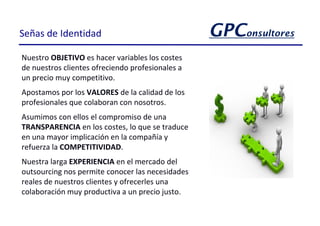 El documento describe el concepto de "outsourcing colaborativo" propuesto por la empresa GPConsultores. Este modelo busca reducir los costos de outsourcing para los clientes en hasta un 35% al mismo tiempo que mejora la retribución de los trabajadores subcontratados en hasta un 20%. GPConsultores logra esto ajustando al máximo sus gastos generales y aplicando un margen reducido, lo que crea un modelo "ganar-ganar" para la empresa cliente y los empleados subcontratados.