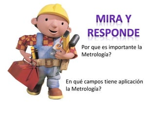 El documento habla sobre la importancia de la metrología y los campos en los que se aplica. Menciona que la metrología es la ciencia de las mediciones y que tiene aplicaciones en diversas áreas como la industria, la ciencia y la vida cotidiana. También describe algunos instrumentos comúnmente usados para realizar mediciones como balanzas, calibres y cintas métricas.
