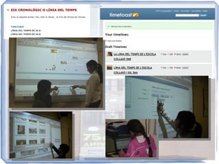 Este documento describe un proyecto realizado por estudiantes de 5o grado para celebrar el 75 aniversario de la Escuela Collaso y Gil. Los estudiantes investigaron la historia de la escuela a través de fuentes escritas y audiovisuales, elaboraron preguntas en grupos pequeños, y crearon un video titulado "Atrapats en Sèpia" que recrea la época franquista a través de entrevistas con ex alumnos y la ambientación de escenas con materiales del museo y la escuela.