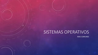 Los sistemas operativos más comunes son Windows, macOS y Linux. Windows domina el mercado de escritorio y ha sido el sistema operativo más instalado. macOS es el segundo sistema operativo más instalado y fue el primero en introducir una interfaz gráfica de usuario. Linux es un sistema operativo de código abierto popular en servidores aunque también se puede instalar en escritorios, dispositivos móviles y más. Android, basado en Linux, es el sistema operativo móvil más popular impulsado por su comunidad de desarrolladores.