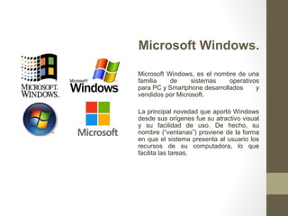 El documento describe los sistemas operativos más utilizados comercialmente, incluyendo Microsoft Windows, Mac OS X, Ubuntu, y Android. Microsoft Windows es el sistema operativo más popular para PC y smartphones, mientras que Mac OS X es exclusivo para computadoras Apple. Ubuntu es un sistema operativo de código abierto basado en Linux, y Android es el sistema operativo dominante para dispositivos móviles, inicialmente desarrollado por Android Inc. y ahora propiedad de Google.