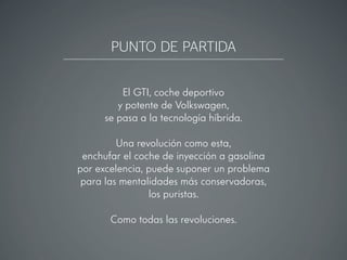 El documento habla sobre la introducción de la tecnología híbrida en el Volkswagen GTI, un automóvil deportivo conocido por su potencia. Algunos pueden ver esto como una traición a la esencia del automóvil. Sin embargo, la historia muestra que los cambios revolucionarios a menudo son incomprendidos inicialmente, como cuando Bob Dylan introdujo la guitarra eléctrica en el Newport Folk Festival en 1965, un momento que finalmente cambió el curso de la historia de la música popular. Al igual que hubo guitarras eléctricas antes,