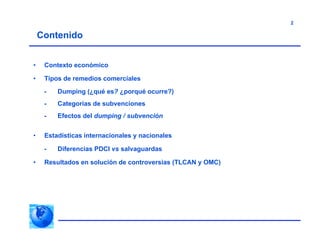 El documento aborda las prácticas desleales en el comercio internacional, centrándose en el dumping y las subvenciones, así como en los distintos remedios comerciales disponibles. Se discuten los efectos económicos y discutidos sobre la producción nacional, junto con estadísticas y ejemplos de casos dentro y fuera de México. Además, se analizan las controversias y soluciones en el marco del TLCAN y la OMC, proporcionando datos sobre investigaciones de antidumping y subsidios.