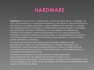 El documento habla sobre hardware y software. Define hardware como las partes físicas de una computadora como componentes electrónicos, cables, gabinetes, periféricos. Define software como los componentes lógicos como sistemas operativos, aplicaciones, programas. Describe las diferentes clasificaciones de hardware y software, incluyendo hardware básico, complementario y tipos de software como sistemas operativos, programación, aplicaciones.